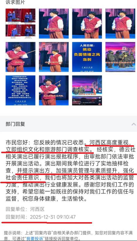 我们再看天津市河西区是怎么回复的,市民您好:您反映的情况已收悉。河西区高度重视,立即组织文化和旅游部门调查核实。 经核实,德云社相关演出已履行演出报批程序,由审批部门依法审批开展演出活动。演出期间我单位进行了实地抽样检查,并提示演出方,加强演员管理与素质提升,强化社会责任意识,我们也将加大对各类演出活动的监管力度,推动演出行业健康发展。