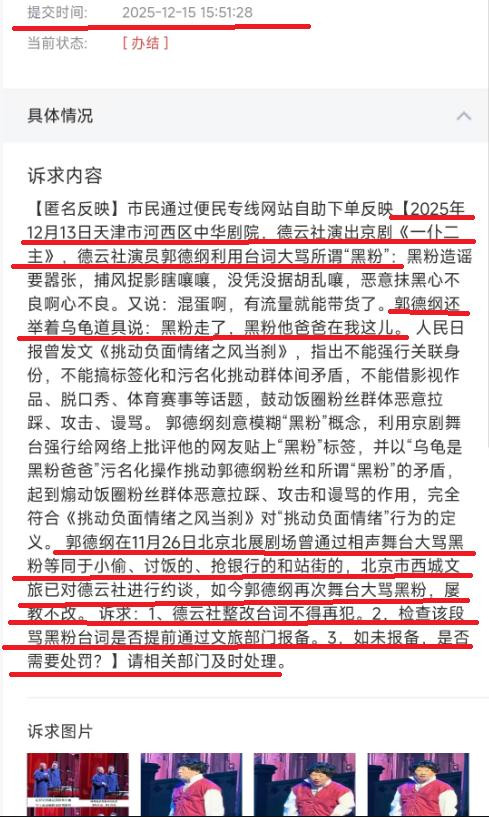 网友曝光的投诉单信息显示,此次投诉发起时间是2025年12月15日,针对的是德云社于2025年12月13日在天津市河西区中华剧院演出的京剧《一仆二主》,郭德纲利用台词大骂所谓“黑粉”。