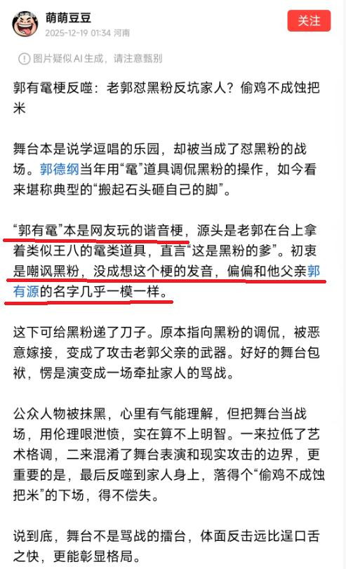 网友认为, 郭德纲刻意模糊“黑粉”概念,利用京剧舞台强行给网络上批评他的网友贴上“黑粉”标签,并以“乌龟是黑粉爸爸”挑动郭德纲粉丝和所谓“黑粉”的矛盾,起到煽动饭圈粉丝群体恶意拉踩、攻击和谩骂的作用,属于“挑动负面情绪”行为。