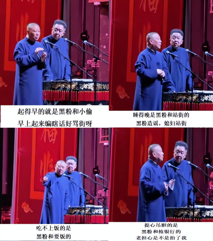 网友还特别强调,这不是郭德纲第一次在舞台上大骂黑粉,他在11月26日北京北展剧场曾通过相声舞台大骂黑粉等同于小偷、讨饭的、抢银行的和站街的,北京市西城文旅也已对德云社进行约谈并要求立即整改。